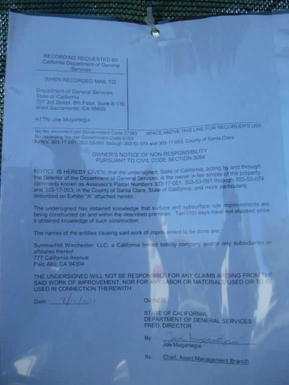 - On Friday, September 16, 2011, someone from the Department of General Services posted a Notice of Non-Responsibility for work that SummerHill is planning on doing. Page 1. Page 2.