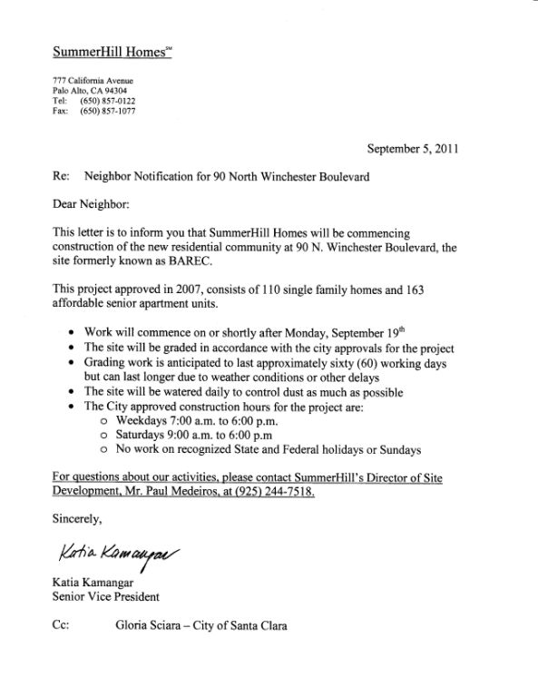 - SummerHill sent a letter out to the neighborhood that they plan on beginning the grading process on the property as early as Monday, September 19, 2011.